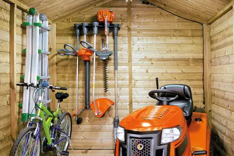 • Хранить садовый трактор необходимо в сухом и хорошо проветриваемом месте, вдали от источников тепла и влаги. Это предотвратит коррозию металлических частей и сохранит резиновые и пластиковые элементы в хорошем состоянии. Также важно, чтобы в помещении было достаточно места для удобного доступа и хранения с соблюдением безопасности.